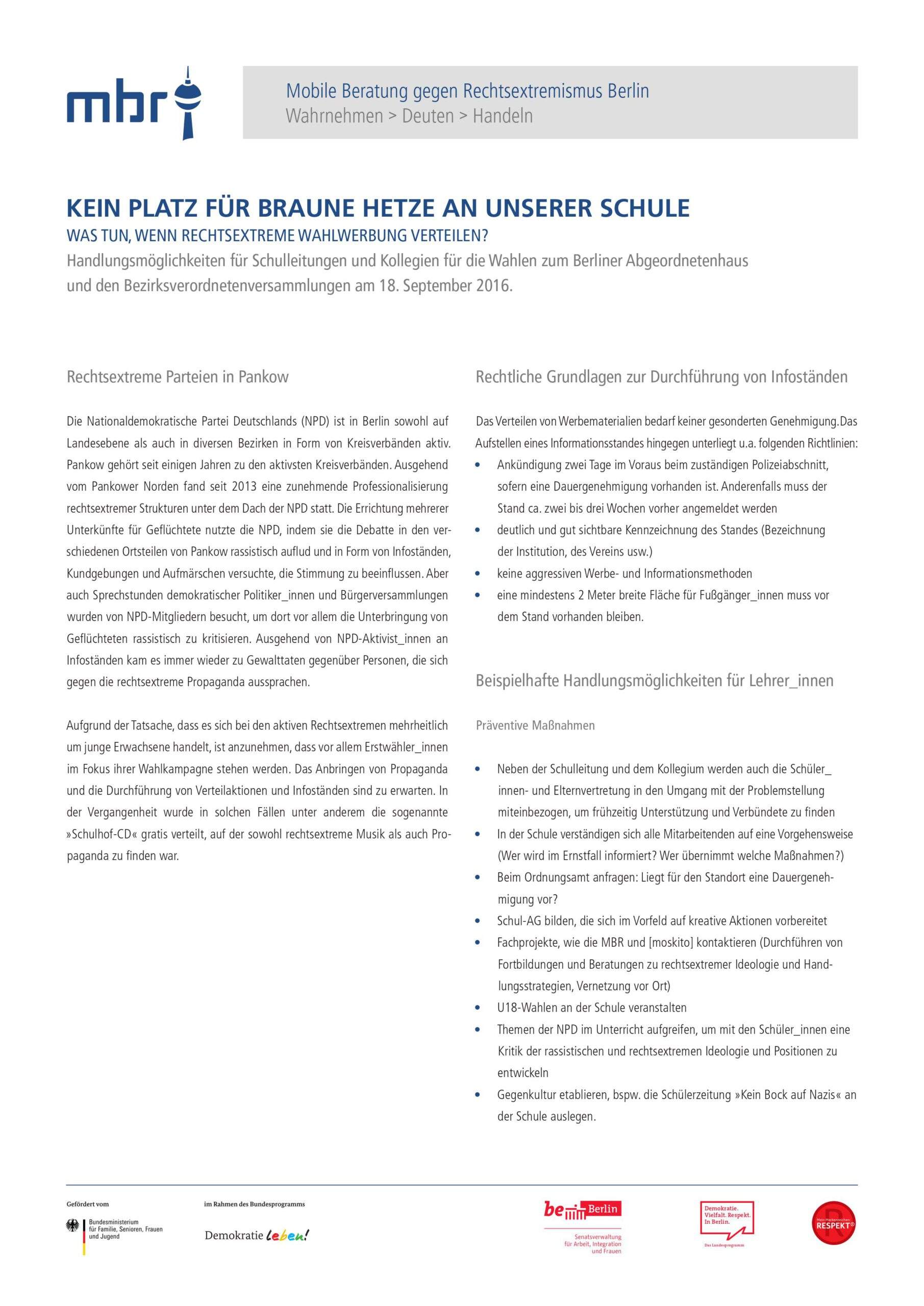 Kein Platz für braune Hetze an unserer Schule (2016); 2 Seiten; Hg.: MBR/VDK e.V.