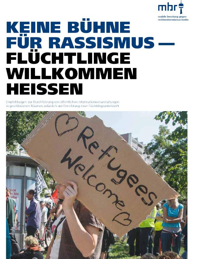 Empfehlungen zur Durchführung von öffentlichen Informationsveranstaltungen in geschlossenen Räumen anlässlich der Einrichtung einer Flüchtlingsunterkunft. Weltweit sind Hunderttausende Menschen durch Krieg und politische oder religiöse Verfolgung gezwungen, ihre Heimat zu verlassen. Die Aufnahme von Flüchtlingen ist nicht nur eine humanitäre Notwendigkeit, sondern auch eine rechtliche Verpflichtung nach dem deutschen Asylgesetz. Dennoch gibt es derzeit deutschlandweit auch … Continue reading Keine Bühne für Rassismus – Flüchtlinge willkommen heißen! (2013)