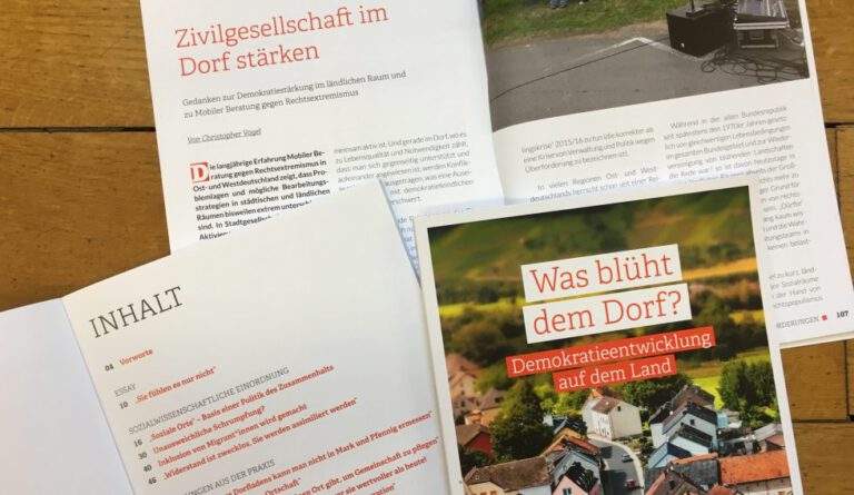In ländlichen Räumen werden an die Auseinandersetzung mit Rechtsextremismus und menschenfeindlichen Einstellungen spezifische Herausforderungen gestellt. Die öffentlichen Infrastrukturen sind hier anders ausgeprägt als in Städten. Das schafft Freiräume, fordert aber auch verstärkt individuelles Engagement. Ausgehend von einer Tagung des Bundesverbands Mobile Beratung gemeinsam mit der Bundeszentrale für politische Bildung im Herbst 2018 leuchtet ein multiprofessioneller … Was blüht dem Dorf? Demokratieentwicklung auf dem Land (2019) weiterlesen