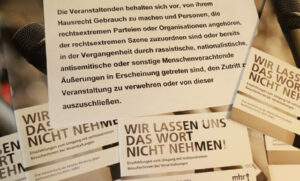 Die Broschüre bietet zahlreiche Argumente für den Ausschluss von Rechtsextremen von öffentlichen und nichtöffentlichen Veranstaltungen – sei es im Wahlkampf, bei einer Bürger_innenversammlung oder im Volkshochschulkurs.
