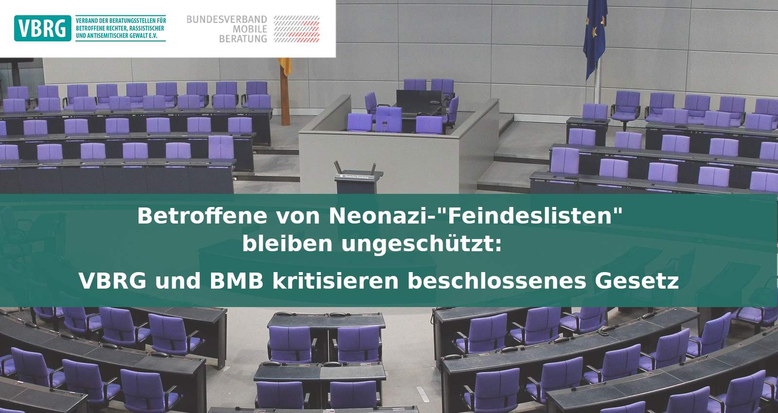 Der Bundestag hat in der Nacht vom 24./25. Juni 2021 ein Gesetz (19/28678, 19/31115) verabschiedet, das unter anderem den Schutz gegen rechte „Feindeslisten“ verbessern soll – mit dem neuen Paragrafen 126a StGB, der das Verbreiten solcher Listen künftig unter Strafe stellen soll. Doch beim Schutz der Betroffenen bleiben gravierende Lücken, kritisieren der Bundesverband Mobile Beratung (BMB) und der Verband der Beratungsstellen für Betroffene rechter, rassistischer und antisemitischer Gewalt (VBRG).