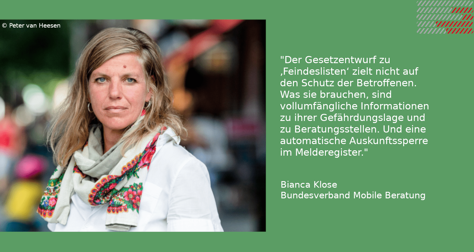 Im Bundestag/Rechtsausschuss hat heute eine Sachverständigenanhörung zum Thema „Feindeslisten“ stattgefunden. Auch MBR-Projektleiterin Bianca Klose hat dort in ihrer Rolle als Vorstandsmitglied des Bundesverbands Mobile Beratung e.V. als Expertin gesprochen.